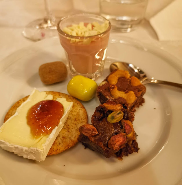 ...innan det var dags att inta kvällens trerätters som startade med ett glas bubbel och lite snacks i baren innan middagen serverades på Drottning Viktorias veranda.