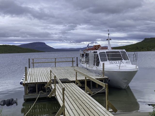 Lite fakta om båtturen: Båten MS Malla avgår från en brygga nedanför Kilpisjärvi Holiday Village & Camping, ca 4 km norr om själva samhället. Det är två avgångar dagligen kl 10 och 15 (om det går fler avgångar under högsäsong vågar jag inte skriva något om). Biljetter kan inte bokas utan först till kvarn. Biljetter för vuxna kostar 50€ t o r eller 35€ enkel resa. Man kan betala kontant eller med kort, men det står att det är bra om man har pengar för ibland fungerar inte kortläsare. Resan tar som sagt 30 min och båten ligger sedan kvar i två timmar så hela turen tar alltså tre timmar. Båtarna börjar gå när isen släppt, i år var det isfritt den 12 juni så båtturerna började vid midsommar och fortsätter en god bit in i september.